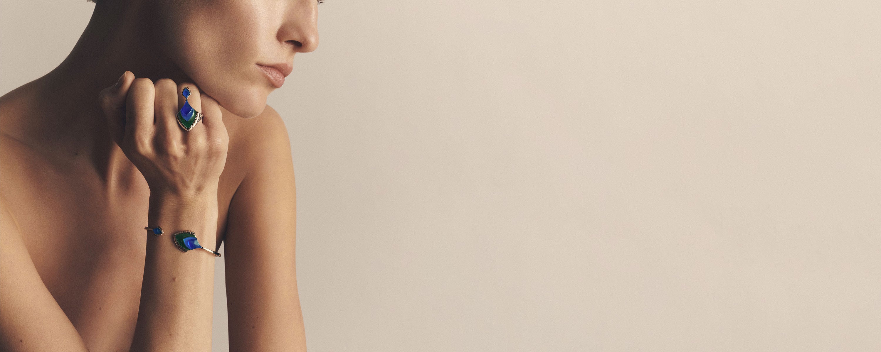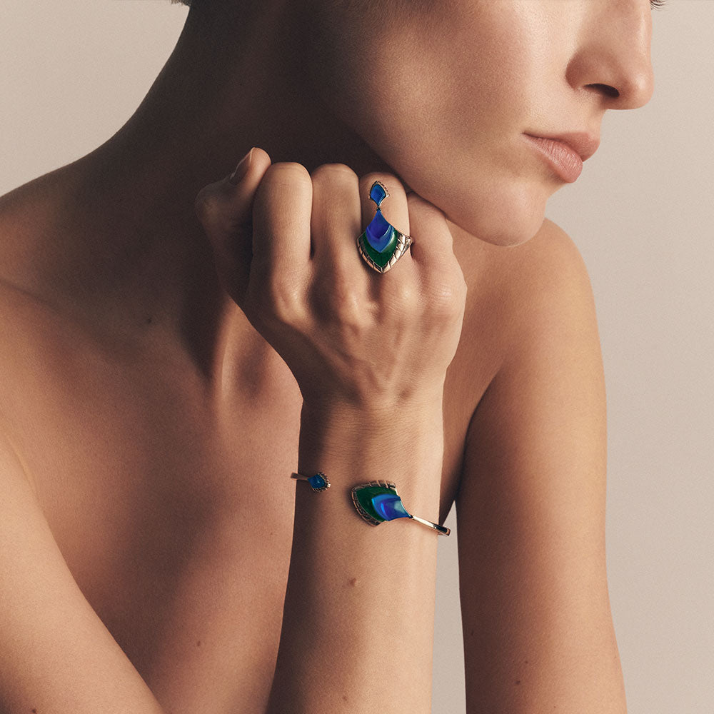 Pour sa collection de bijoux Paon, la Maison Lalique livre une interprétation graphique et stylisée des plumes irisées de cet animal emblématique.