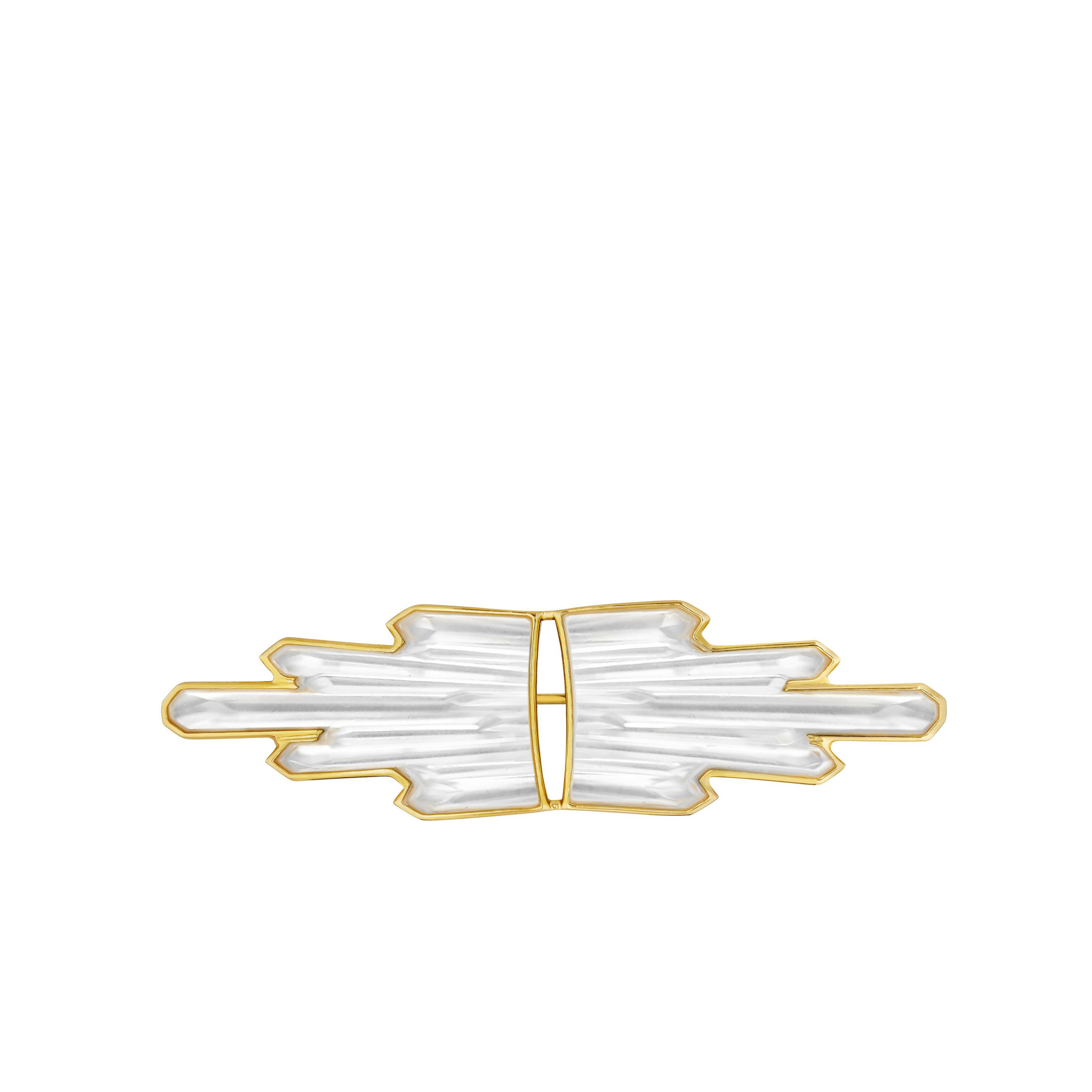Sur cette broche, un duo de cristaux se fait face, créant un jeu captivant de lumière et de reflets. Lalique s’est inspiré des minéraux façonnés par les siècles pour recréer leur beauté naturelle dans la collection Terramineral. Prouesse de fabrication, la fine monture de métal épouse parfaitement les contours délicatement ciselés du cristal, révélant ses reliefs détaillés.