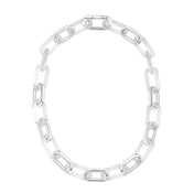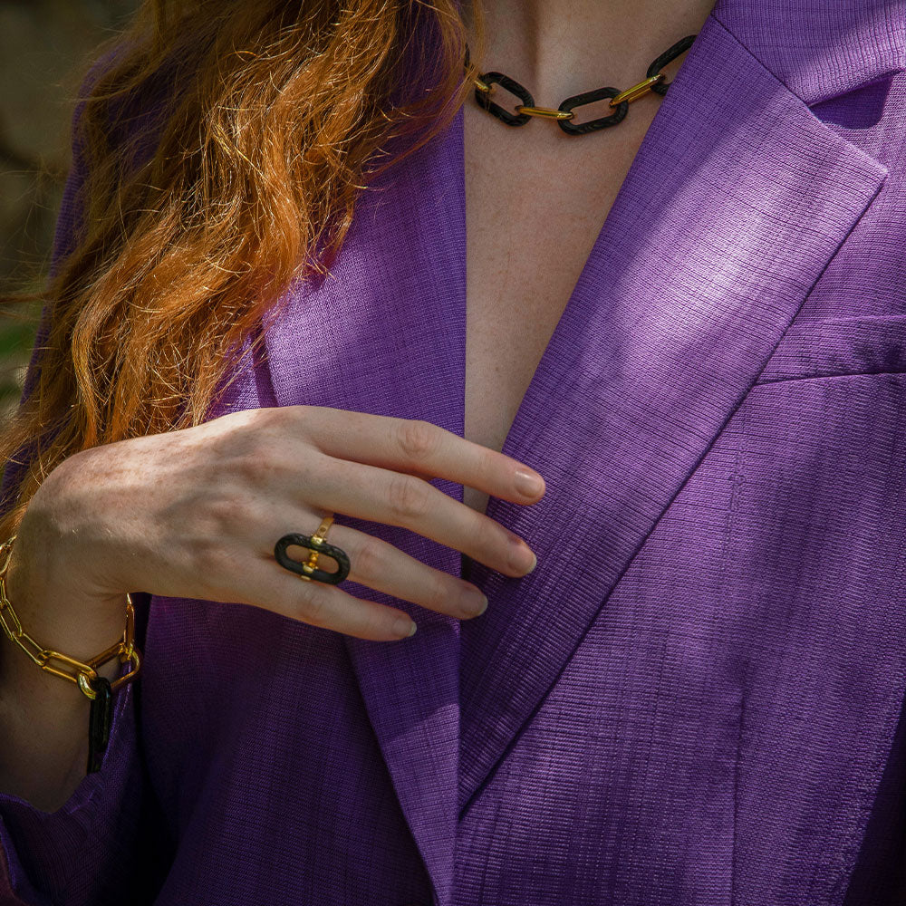 Tel un imprimé, les lignes zébrées parcourent le cristal et sont stoppées net par des tranches lisses, un jeu de textures sensible au toucher. Les maillons de métal et de cristal s’enchaînent et s’alternent pour composer des parures fortes et élégantes à la fois.