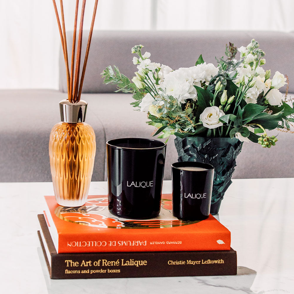 Un diffuseur d’exception, essence du savoir-faire raffiné de la maison Lalique. Sur le flacon de cristal dépoli s’érige avec panache un doux motif de plumes, inspiré du motif «petites feuilles» créé par René Lalique en 1910. Paré d’un cache-col miroitant, le diffuseur accueille des bâtonnets qui plongent dans la solution olfactive et s’en imprègnent pour diffuser avec puissance un instantané d’ailleurs. Une évasion olfactive à piocher à l’envie parmi trois créations de haute parfumerie.