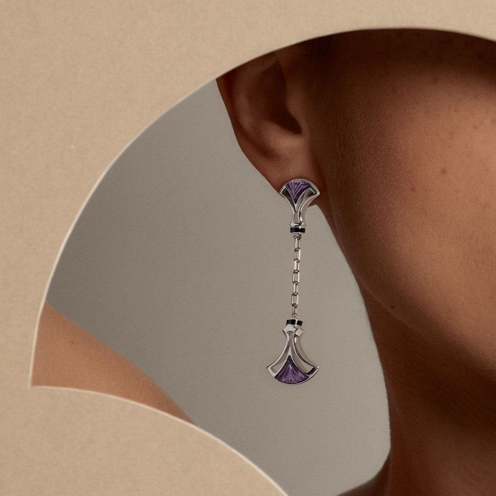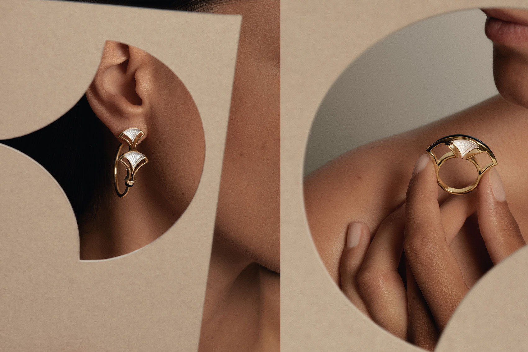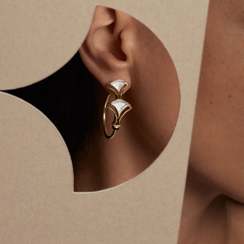Subtly sculpted lines radiate on the crystal of this jewellery collection. The geometric silhouette of the openwork frame is inspired by the decorative structures of the Art Deco period, with arches combining metal and glass. A thin line of black lacquer comes to complete the aesthetic of the collection.